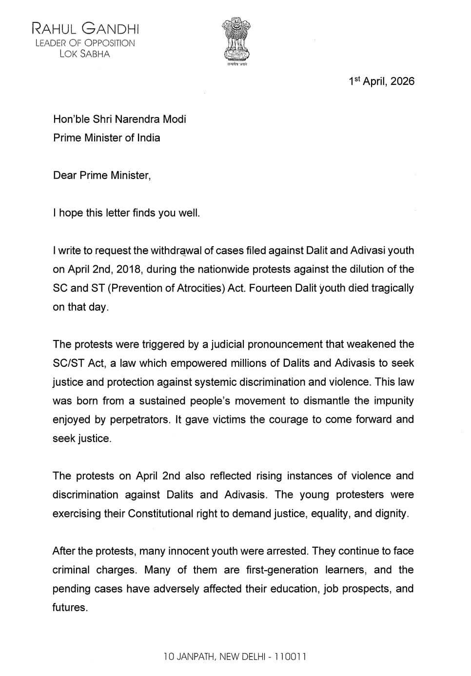 नई दिल्ली, 02 अप्रैल। देश की राजनीति में दलित अधिकारों और सामाजिक न्याय का मुद्दा एक बार फिर केंद्र में आ गया है। कांग्रेस नेता और लोकसभा में विपक्ष के नेता Rahul Gandhi ने प्रधानमंत्री Narendra Modi को पत्र लिखकर 2018 के एससी-एसटी एक्ट बचाओ आंदोलन के दौरान दर्ज मुकदमों को वापस लेने की मांग की है। इस मुद्दे को लेकर कांग्रेस ने केंद्र सरकार पर तीखा हमला बोला है और इसे सामाजिक न्याय से जुड़ा गंभीर विषय बताया है।