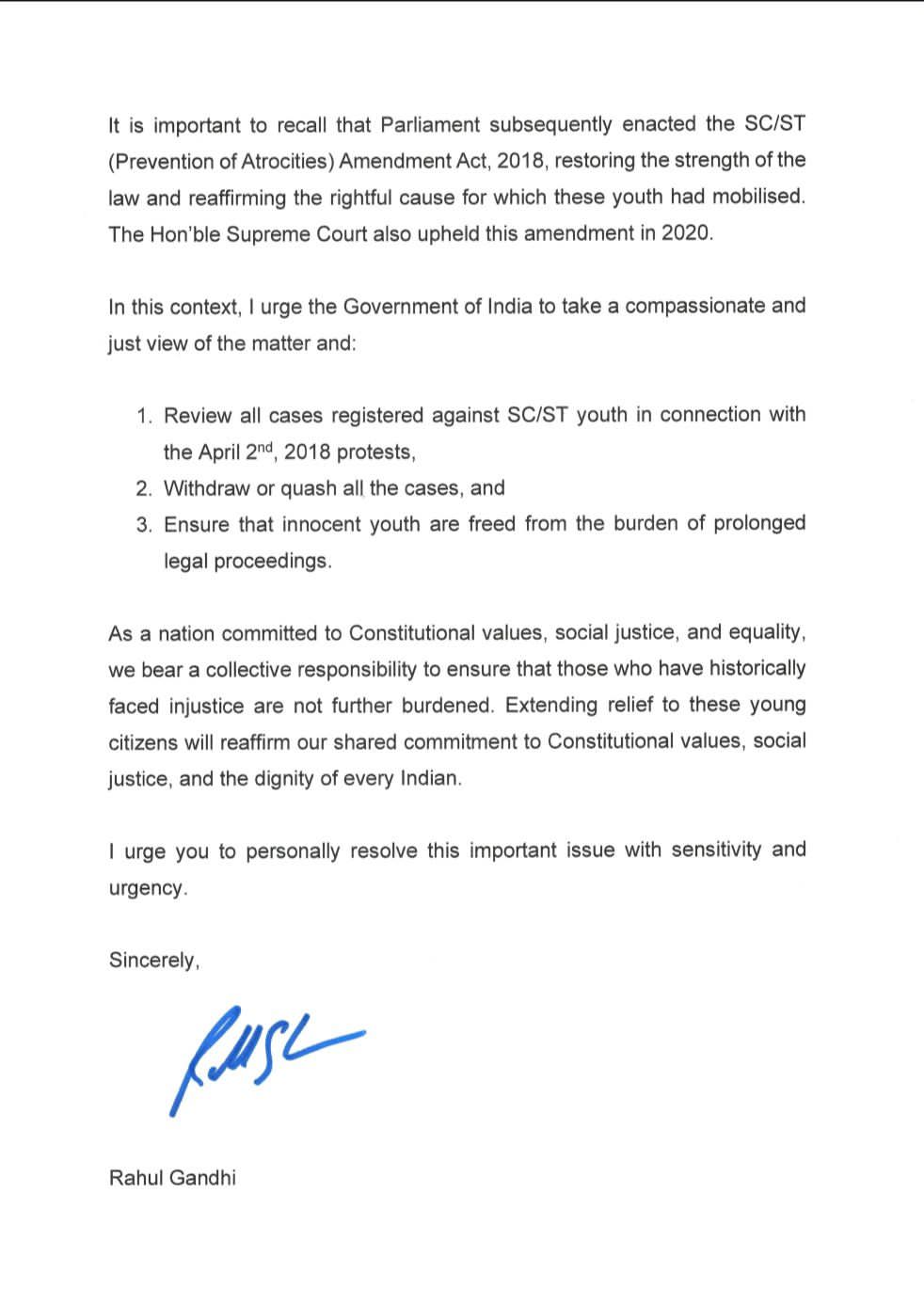 राहुल गांधी ने प्रधानमंत्री से अपील की कि वे व्यक्तिगत हस्तक्षेप करते हुए इन मामलों को समाप्त कराने की दिशा में कदम उठाएं। उन्होंने यह भी कहा कि एक मजबूत एससी-एसटी एक्ट सिर्फ कानून नहीं, बल्कि सामाजिक न्याय की आधारशिला है।