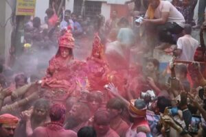 दरसन दै निकरि अटा में ते, दरसन दै… गाते हुए हुरियारों ने ध्वजा को किशोरी जी के पास रख दिया। मंदिर परिसर में दोनों गांवों के गोस्वामियों ने समाज गायन में एक- दूसरे पर प्रेम भरे कटाक्ष किए। इसके बाद हुरिया रंगीली गली में पहुंचे तो, हुरियारिनें रंगेश्वर महादेव मंदिर और घरों के दरवाजे पर घूंघट की ओट में टोल बना कर खड़ी मिलीं। उन्हें देख हुरियारों ने पंचम वेद के पदों का गायन किया तो हुरियारिनों ने भी रसियों से जवाब दिया। सवा पांच बजे एक हुरियारिन ने हुरियारों को खदेड़ने के लिए लाठी मारी, जिसे बड़ी कुशलता से ढाल पर रोक लिया। श्री लाडली जी मंदिर से लेकर रंगीली गली तक राधा- कृष्ण के जयकारे गूंजते रहे। भक्ति और प्रेम के रंग में रंगने के लिए श्रद्धालुओं की इतनी भीड़ उमड़ी कि मंदिर में पैर रखने तक की जगह नहीं थी।